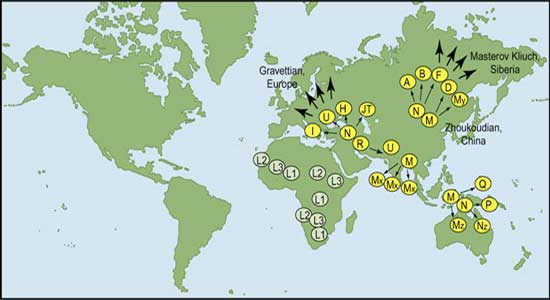 Als sich die unvorhersehbaren Klimaschwankungen der letzten Eiszeit vor ca. 30,000 Jahren (dem Übergang der eiszeitlichen Phase 3 zu 2) stabilisierten, expandierte der moderne Mensch nach Europa und Nord-Asien. Der Neanderthaler (Homo neanderthalensis) hingegen starb aus. Die Archäologischen Funde fossiler Überreste des modernen Menschen in den betreffenden Regionen nehmen nun deutlich zu (Gravett-Kultur in Europa, Überreste der Zhoukoudians in China). Ergänzend sei darauf hingewiesen, dass die Darstellung der mtDNA Haplogruppen aus Platzgründen auf die bedeutendsten eingeschränkt werden musste. |