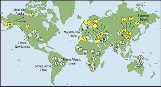 The Bolling/Allerod warm phases (15,000 - 13,000 years ago) caused a partial retrat and a resettlement of northern latitudes by humans. The resulting reduced diversity in the north is evidenced today by the striking predominance of A (nearly 100%) in Eskimo-Aleut and Dene, by the high percentage (50-60%) of H and V in northwestern Europe, and by the complete loss of the minor type X and even the major type B in northern Asia. Distinctive archaeological cultures arise. |
